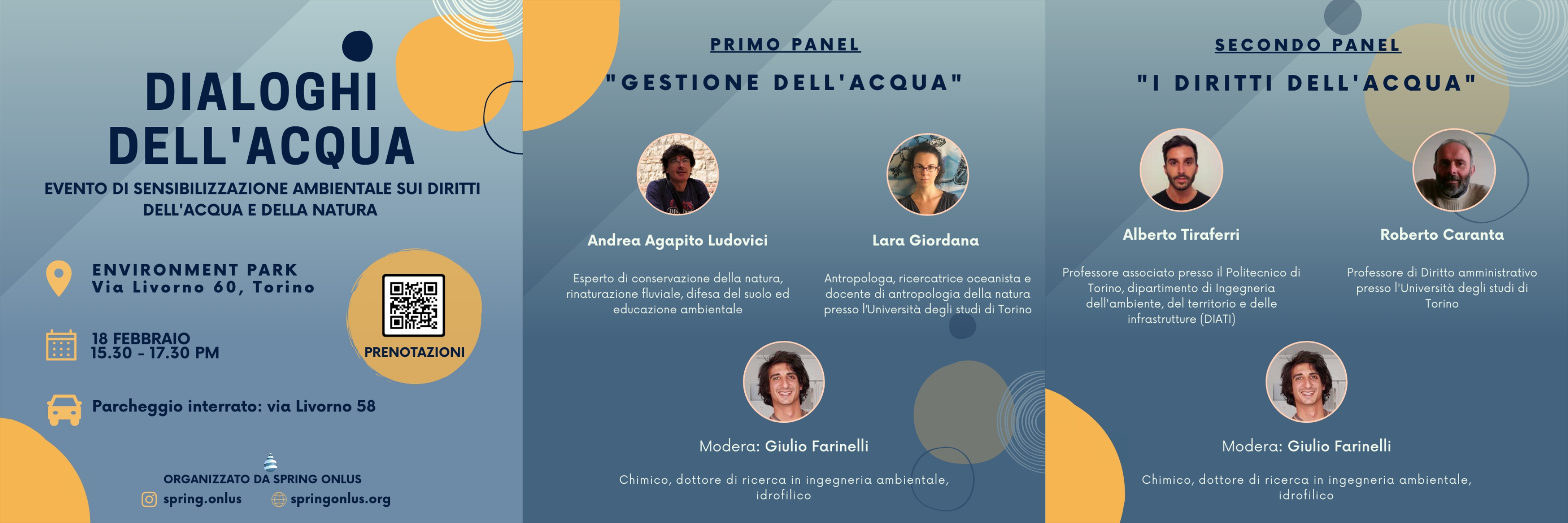 1. “Gestione dell’Acqua”, verterà su progetti e approcci di tutela e rinaturazione degli ecosistemi acquatici. Andrea Agapito Ludovici, esperto nell'ambito della conservazione ambientale si confronterà con la testimonianza di Lara Giordana, antropologa, portavoce di realtà sociali in cui la relazione tra esseri umani e Acqua è molto diversa, poiché equilibrata e sostenibile.